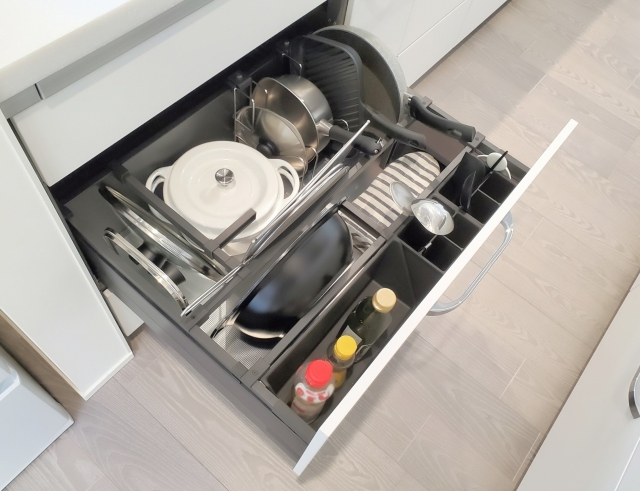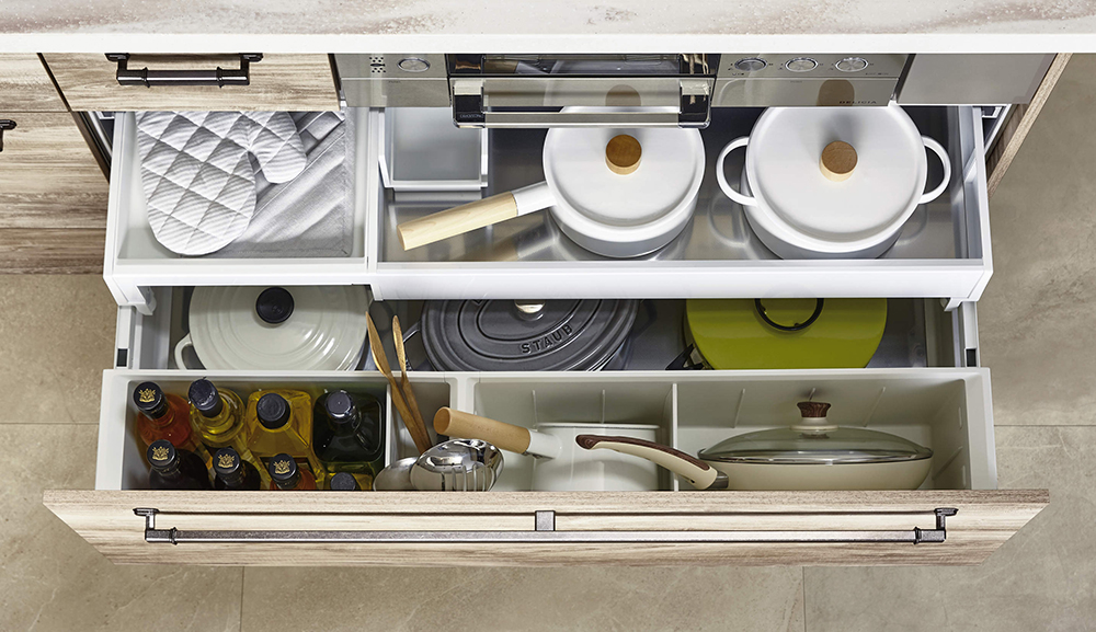 システムキッチンの引き出しを最大限活用してスッキリ見せる収納術を収納のプロに聞いてみたSUUMOお役立ち情報。