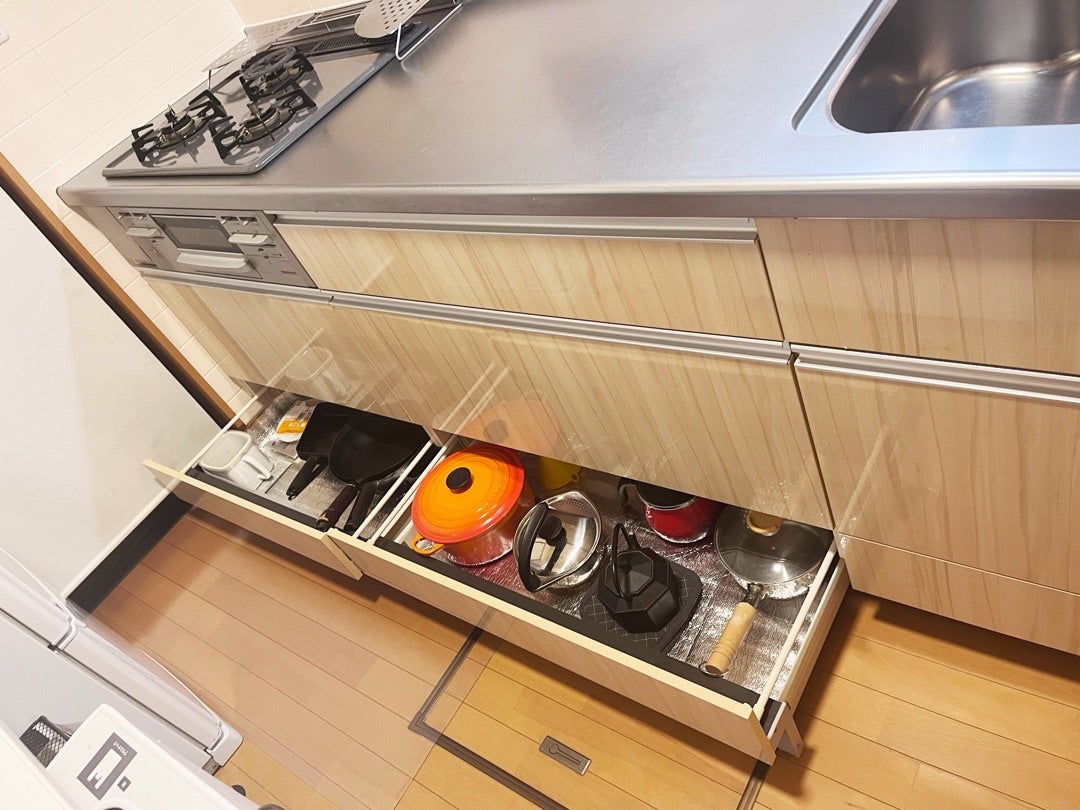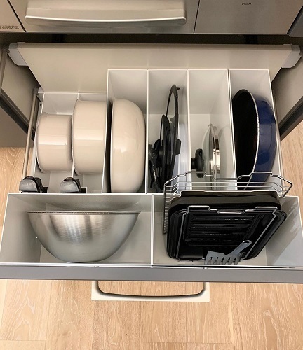 キッチン収納 IH下の引き出しがスッキリ フライパンと鍋が取り出しやすい収納方法のご提案 フライパンスタンド設置。