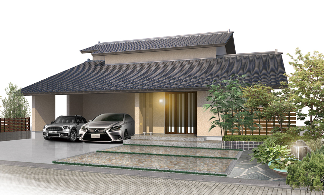 ビルトインガレージ付きのワイドスケールな外観は、白を基調とした和モダンテイスト。塗り壁の外壁が上質な風合い。古来の民家にならって軒と妻を90。
