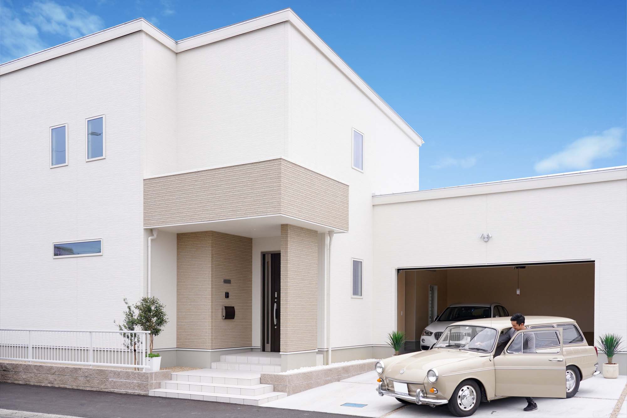 モダンな外観と白を基調としたオープンな室内とが絶妙な調和を見せる、デザイン性と機能性を両立した理想の ガレージハウス 東大阪のガレージハウス -建築主の声 - ザウスの住宅プロデュース建築家と理想の住まいを実現するザウス。