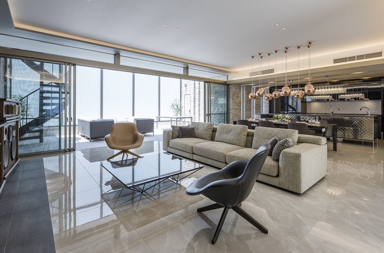 愛車を眺めるビルトインガレージの家サブライムホーム。