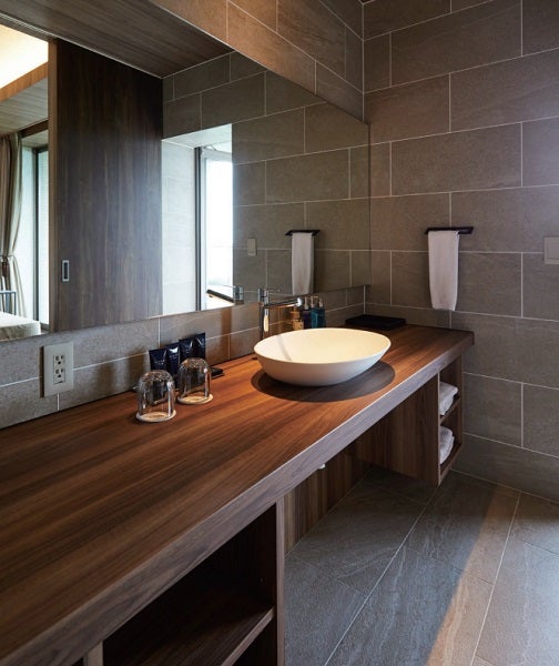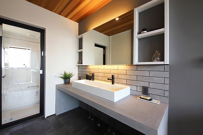 ふと目にとまるスマートな洗面台は、アイカ工業のスタイリッシュカウンター。収納扉を造作し、ホテルのような非日常感をたたえた空間に くふうイエタ。