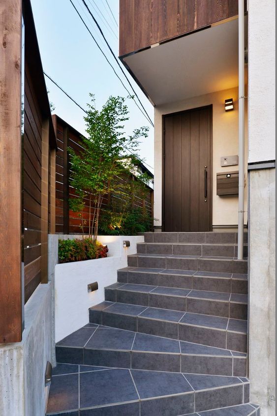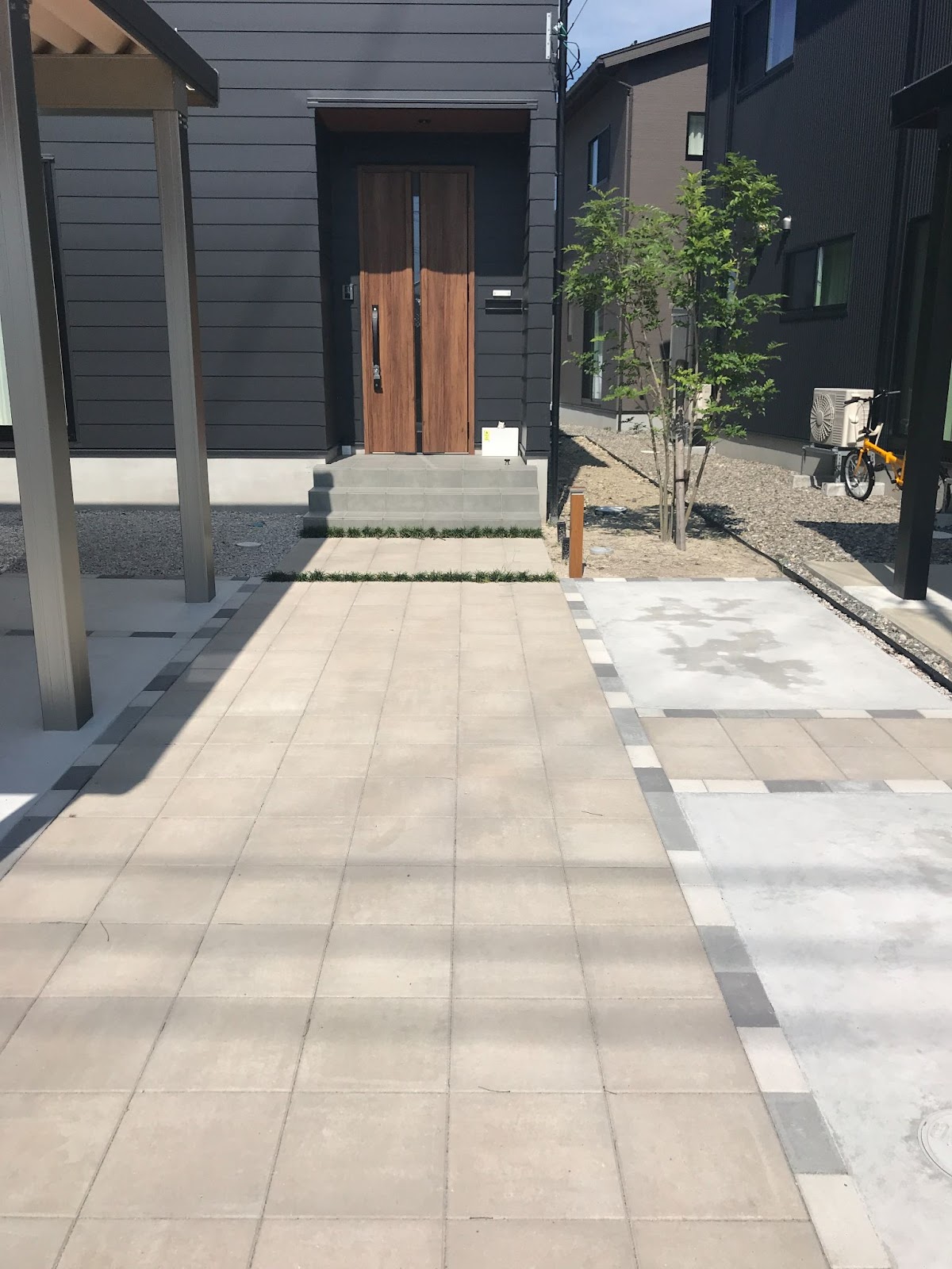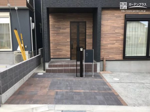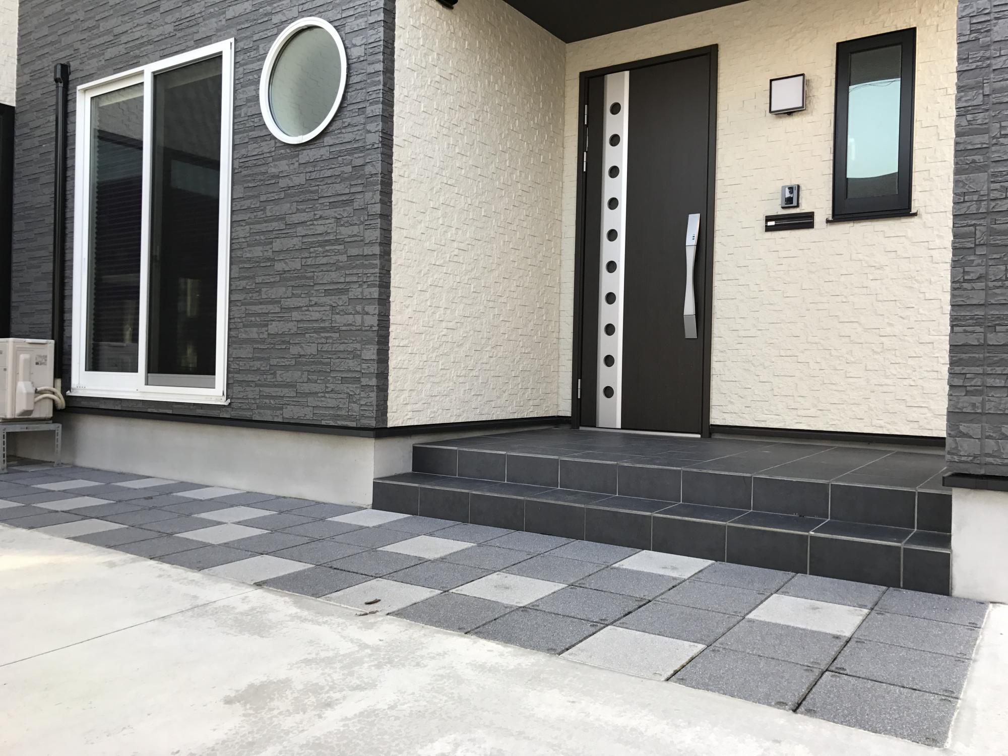 おしゃれモダンな玄関アプローチの仕上げ方 実例 タイルや枕木で外観にもこだわる新築玄関前スタイル不二建設。
