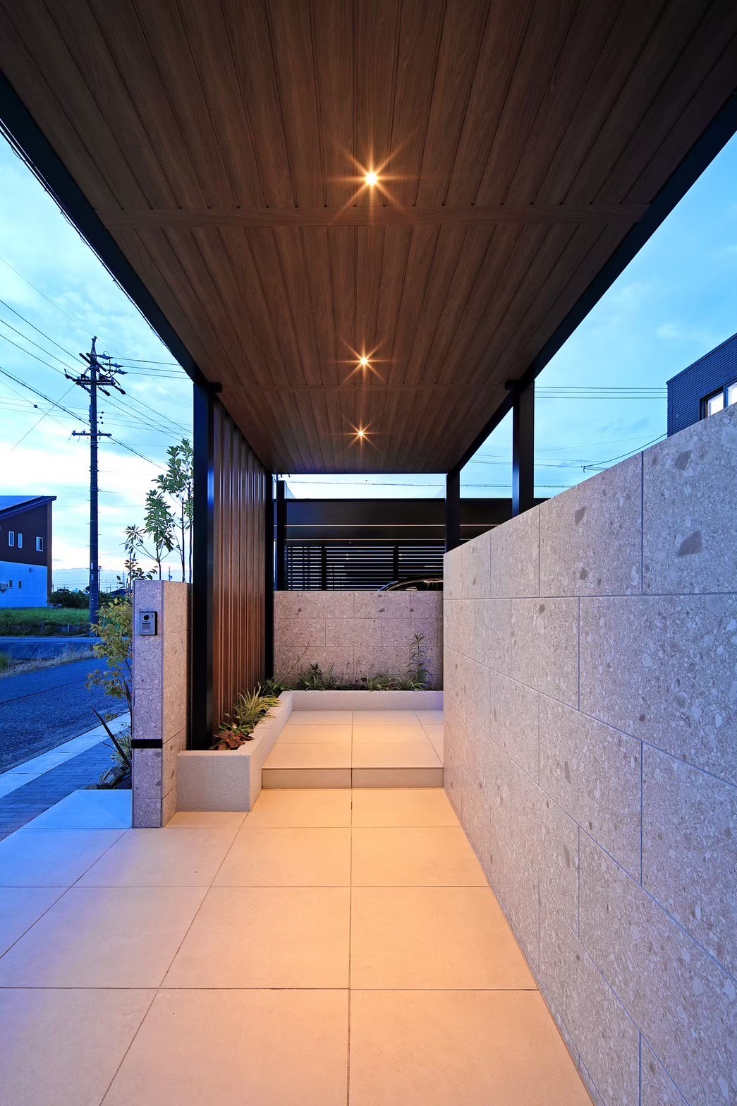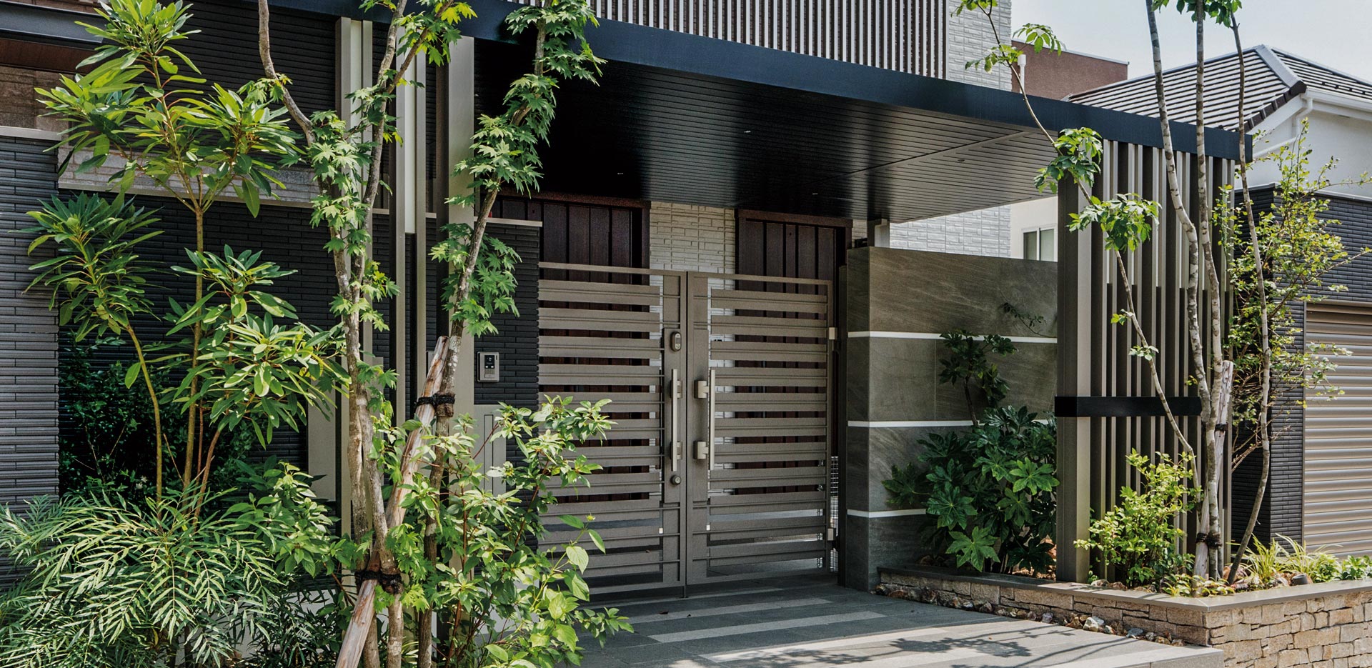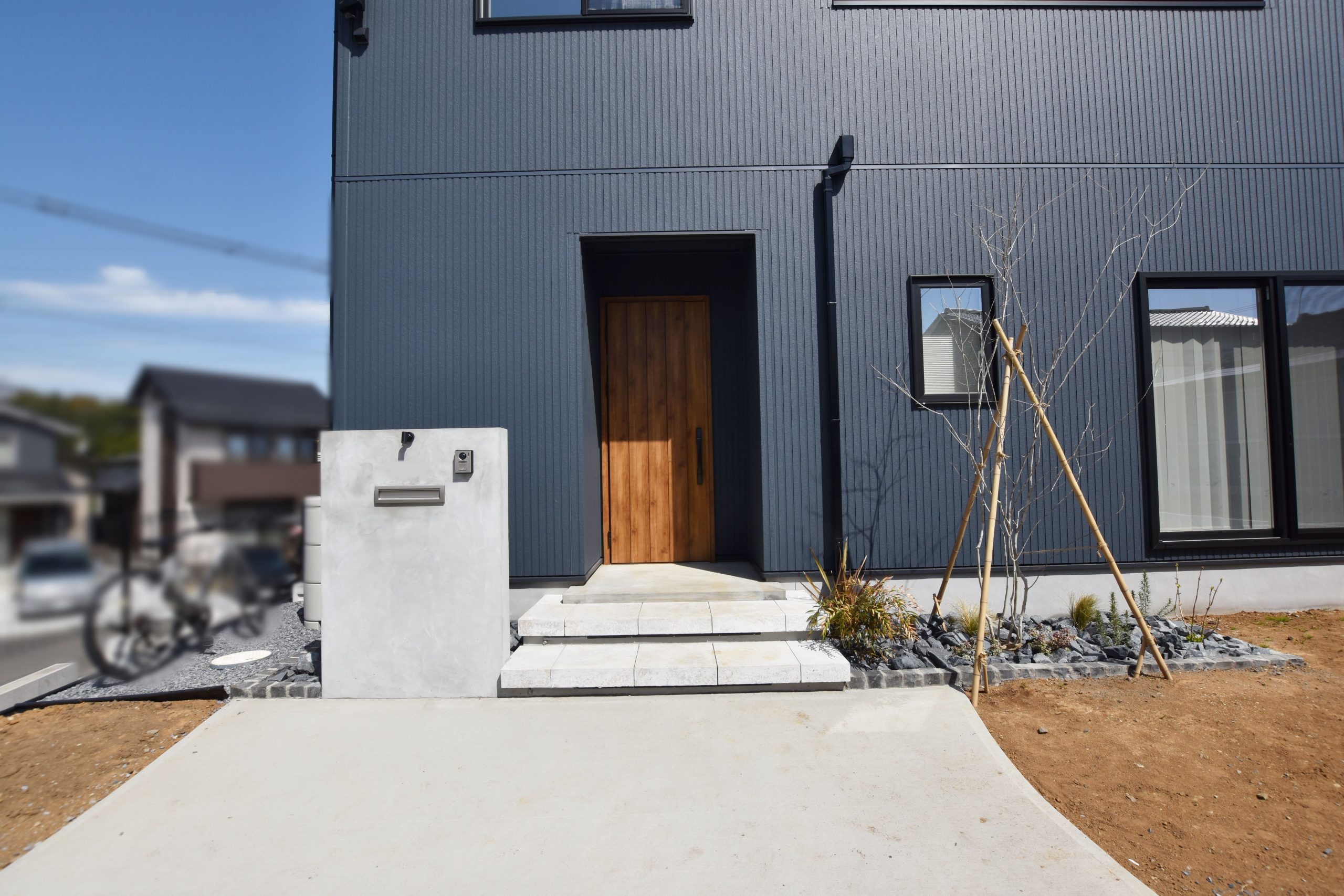 おしゃれモダンな玄関アプローチの仕上げ方 実例 タイルや枕木で外観にもこだわる新築玄関前スタイル不二建設。