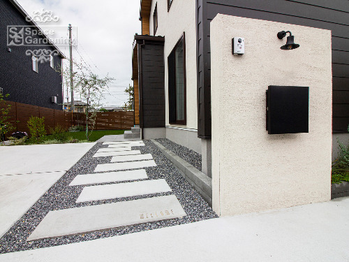 札幌市手稲区スタイリッシュなアプローチ玄関~カーポートへの動線を演出。