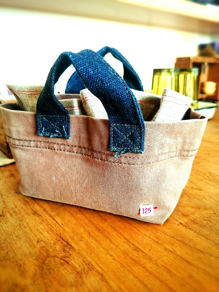 デニムパンツ ジーパン の裾を巾着型ハンドバッグにリメイク!nunocoto fabric。