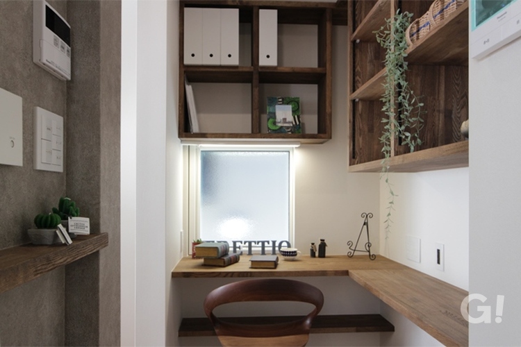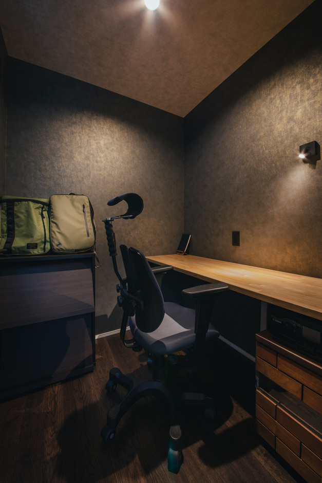 玄関ホールに近い場所に設けたご主人の隠れ家的書斎。ダーク系のクロス、落ち着いた雰囲気のLED照明で男前な空間に仕上げた くふうイエタテ。