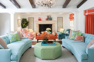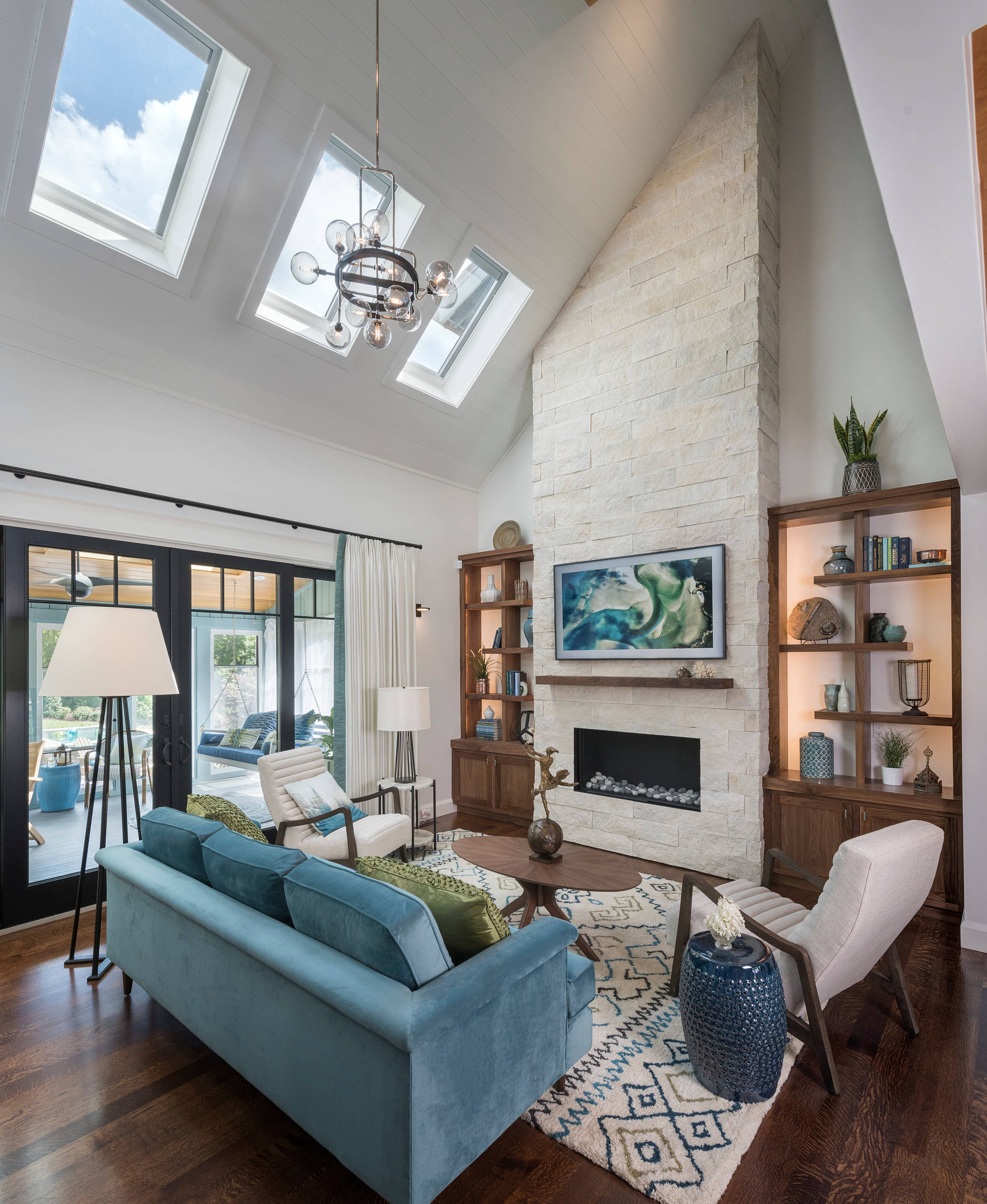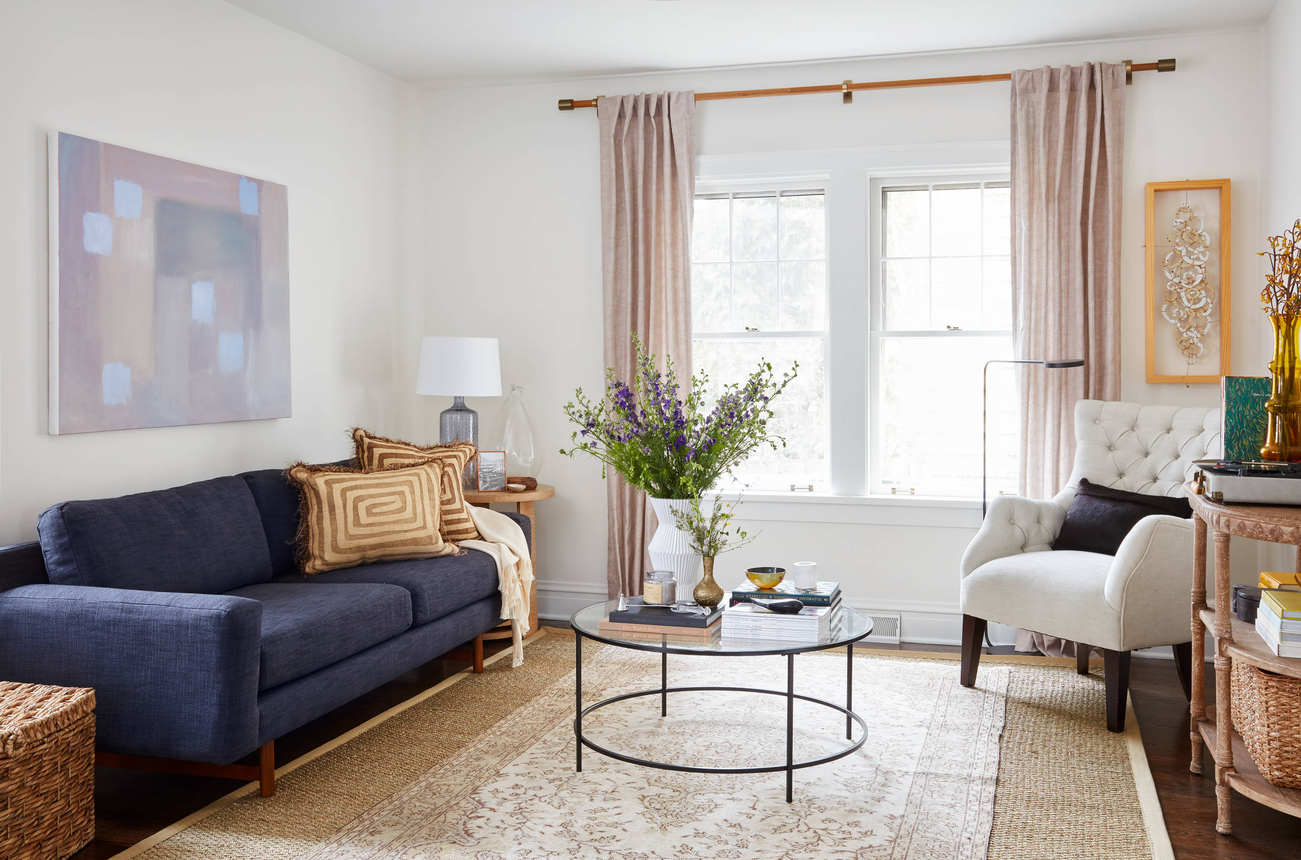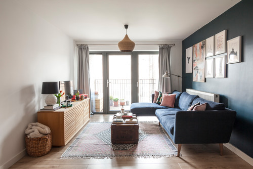 おしゃれなリビング茶色い床、青いソファのインテリア画像 75選 - 2025年10月Houzzハウズ。