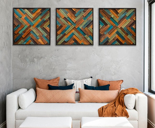 パッチワーク-黒で囲まれた青緑と茶色の色合いの木製の壁の芸術のセット - ショップ Rich Wood Art ウォールデコ・壁紙 - Pinkoi。
