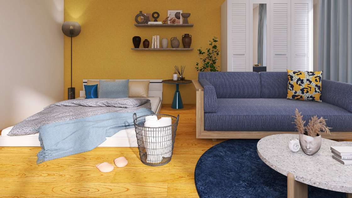 青×黄色でつくる北欧コーデ 爽やか&あたたかな14畳一人暮らしカヴァースインテリア。