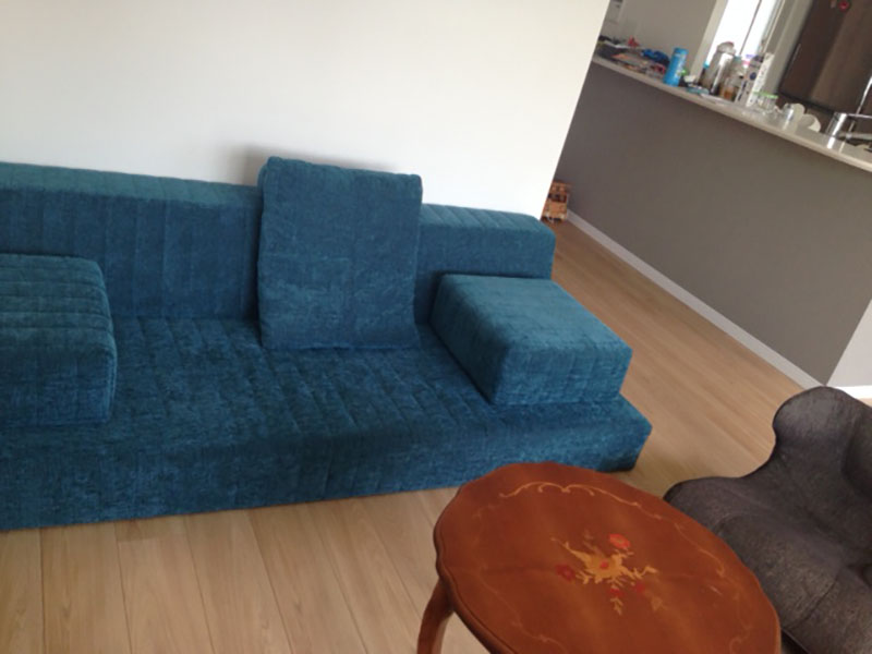 壁紙、インテリア、お部屋の優しい雰囲気に 青のローソファーがしっくりはまっています! – ローソファのある暮らしインテリアコーディネート・部屋例国産ローソファ専門店HAREM。