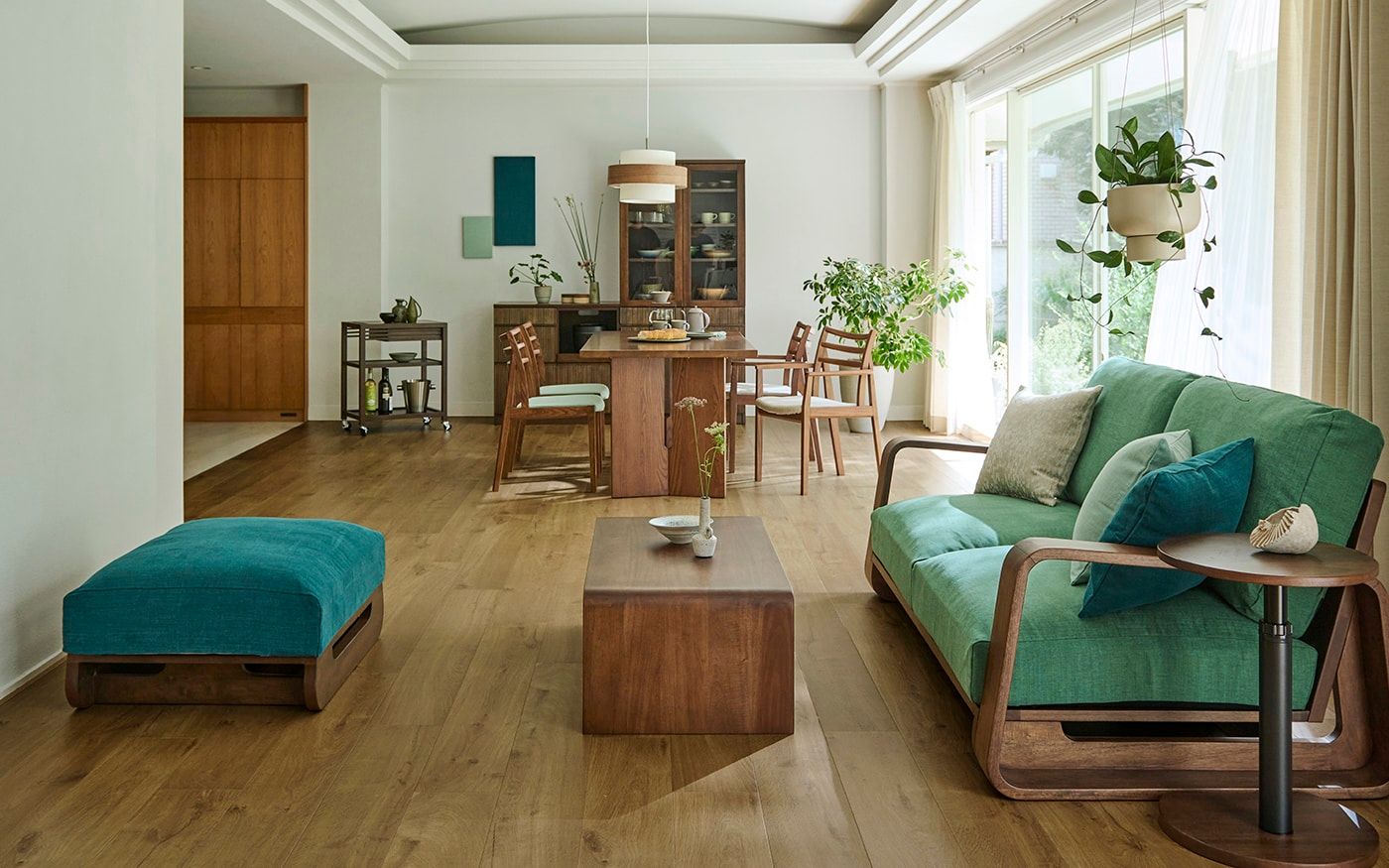 No.248 瑞々しい青緑と無垢材家具に癒されるカラーコーディネートa.flat 風が運ぶ、自然の贈りもの -目黒通り・新宿・大阪梅田 グランフロント北館。