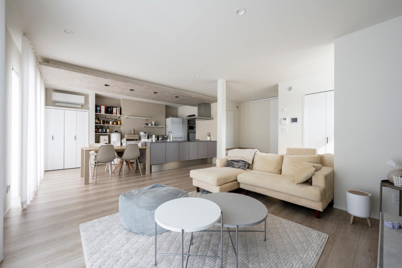 白を基調としたモダンなリビング。 キッチンの下がり天井と、 インテリアにグレーを入れることで 程よく締め感がプラス出来て空間に優しい温もりも生まれます。 上品さを演出してくれるので 大人のスタイリッシュな空間に。
