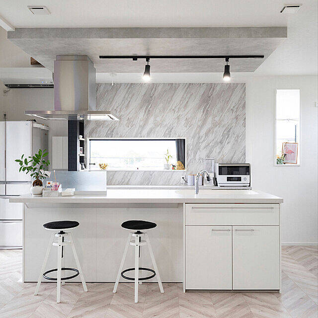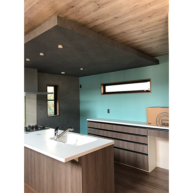 コンクリートクロスで叶うお洒落な下がり天井今回はリリカラの壁紙を素敵に取り入れていただいたキッチンpicをご紹介📸 大人気のあたたかみのある グレージュコンクリート LW4109 LL5227 」をキッチンの下がり天井に使って頂いた事例です。 天井に濃い色を使うと、天井。