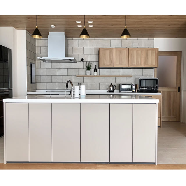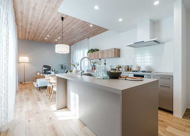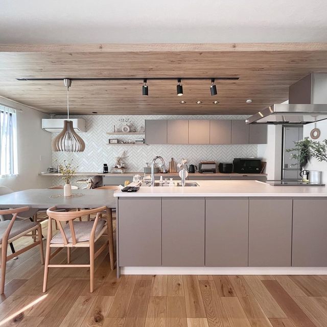 木目調天井 × グレーのキッチンで 彩られた空間。