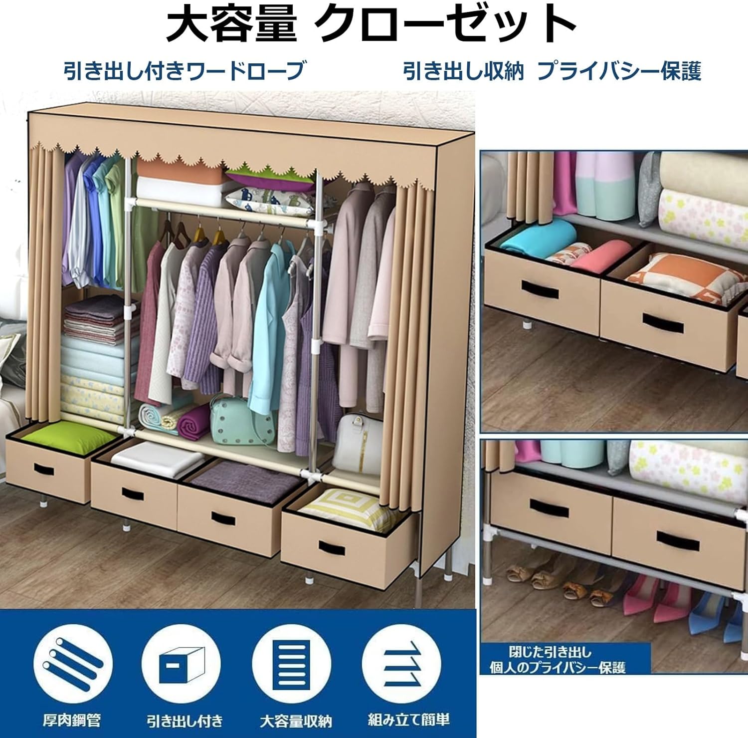 洋室・和室 簡易クローゼット ハンガーラック ワードローブ 簡単組立式 カーテン式カバー付き 360°密閉設計 防塵 防汚、人気ワー クローゼット組み立て式 扉付き 12個組 ハンガーポール付 ワードローブ 自由自在 収納ボックス 軽量 プラスチック 収納ケース 収納ラック。
