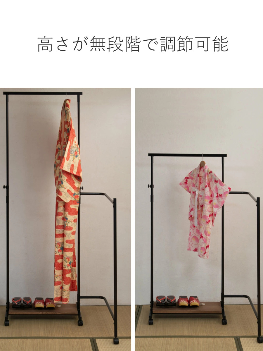 ハンガーラック 着物 IKOU フレキシブル多機能衣桁 桐 キャスター付きコートハンガー 洋服掛け コート掛け 収納 洋服 掛け 衣類 高さ調節スリム 衣桁 棚板 日本製 天然木 和服 和室 折りたたみ おしゃれ 2段 パイプハンガーブラウンブラウン : リビングート。