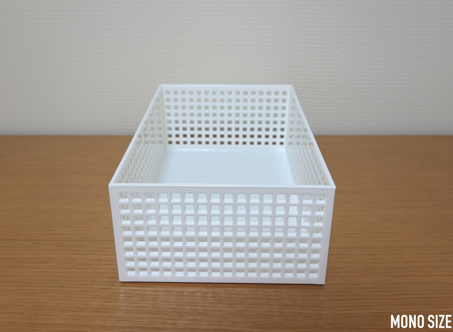 100均「スクエアメッシュ 大」の商品情報とサイズ・収納例。ダイソーで販売 4549131196979。