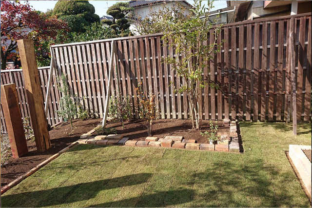 目隠しフェンスの柱が埋めれない場合の施工例有限会社煉創「がんばっ庭」。