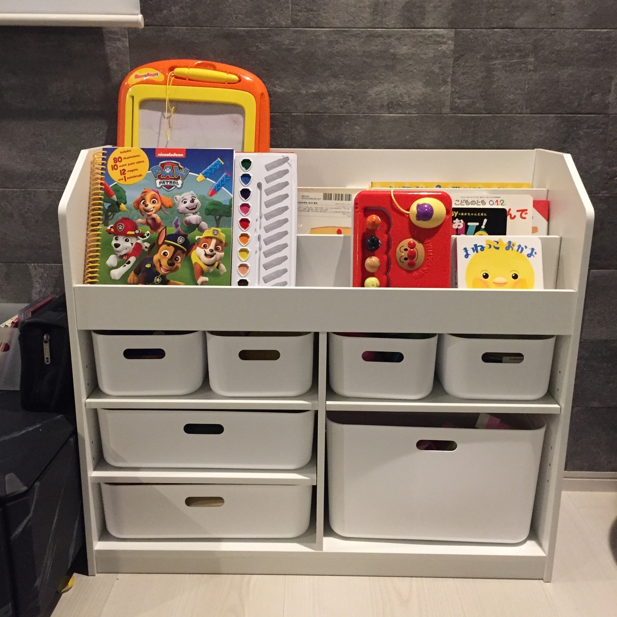子供のシンプルおしゃれな おもちゃ収納棚の決定版!ニトリが シンプル モノトーン でコスパがとっても良い♪ - コソダテと口笛。