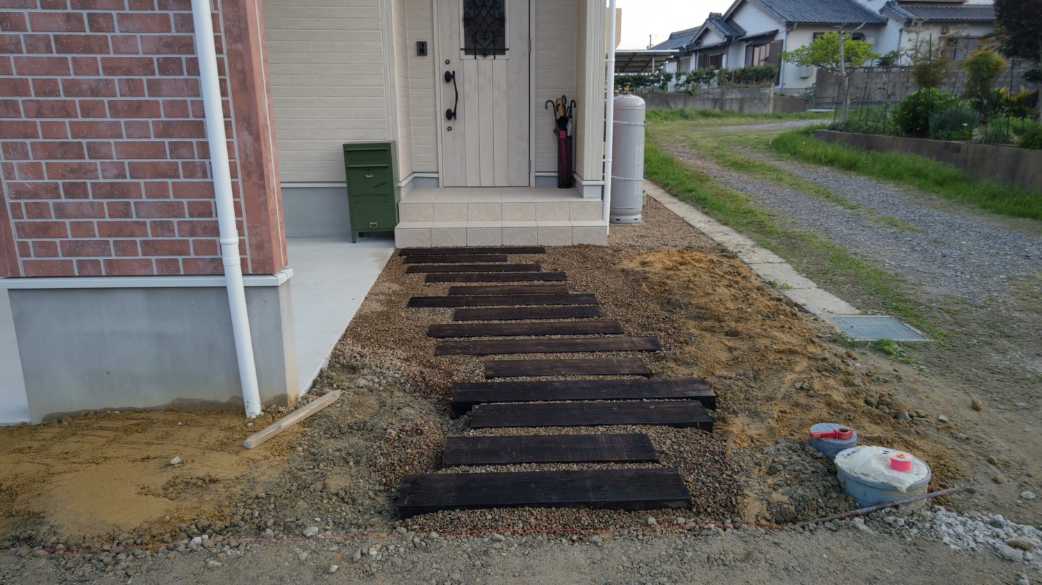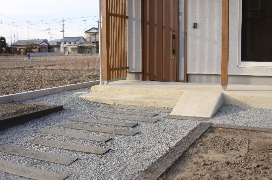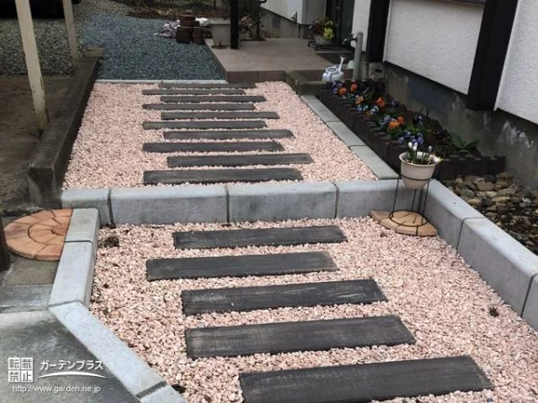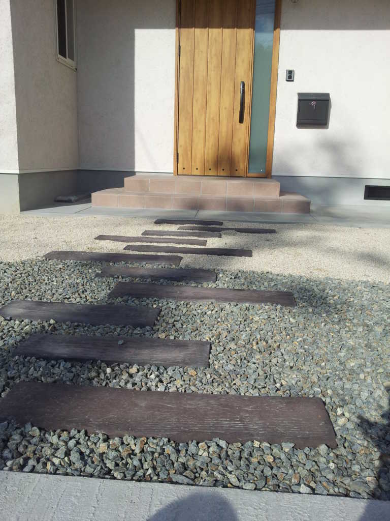 枕木と化粧砂利でつくる玄関までのアプローチ堀内建材。