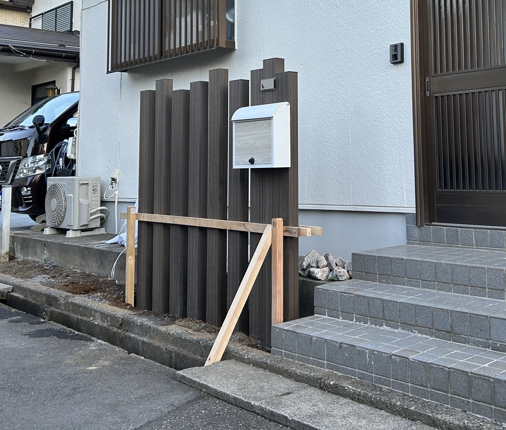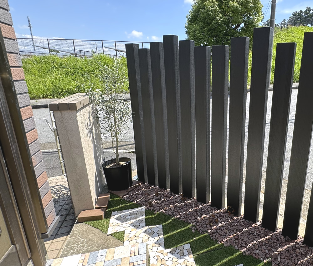 No537玄関前に設置した人工木枕木 チャコールブラック目隠しフェンス・ウッドデッキ専門店のエコウッド。