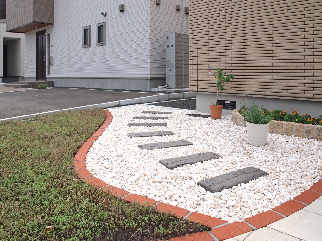 枕木と化粧砂利とハーブマットのアプローチ札幌市W様邸ホワイトガーデンエクステリア 札幌 外構 ガーデニング。