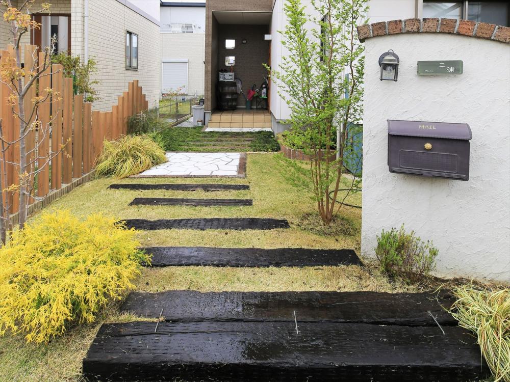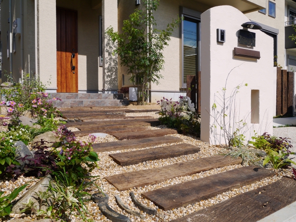 枕木のおしゃれな玄関アプローチ施工例♪種類や腐食対策も解説ミモザガーデン。