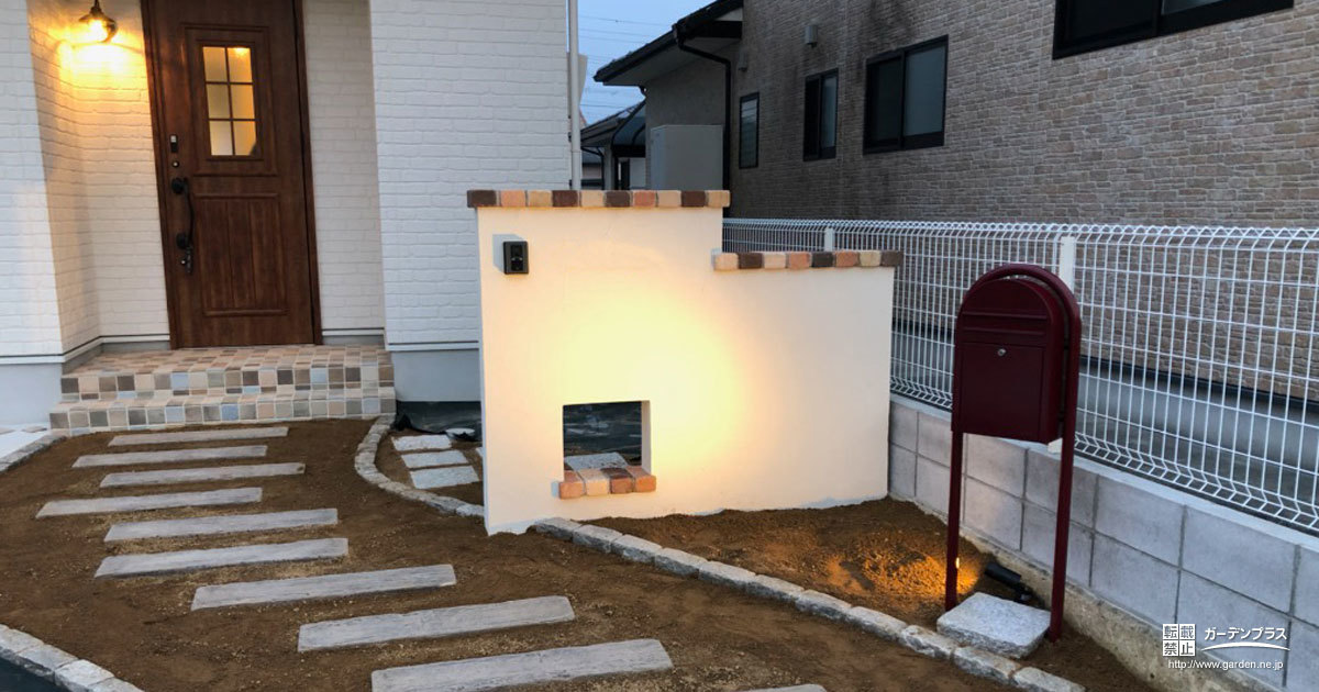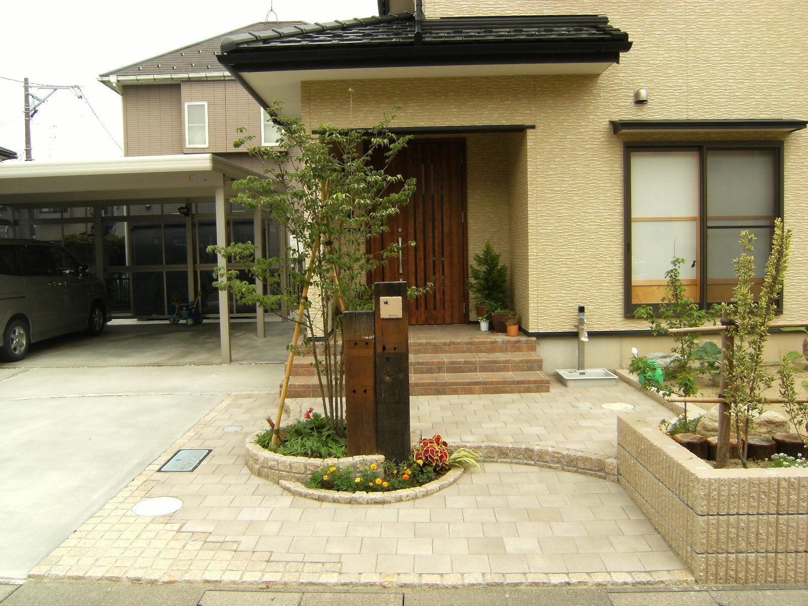メンテナンスを減らし、玄関前を枕木門柱でポイントに 新潟市K様邸│新潟市外構・エクステリア・庭ラーバンテック。