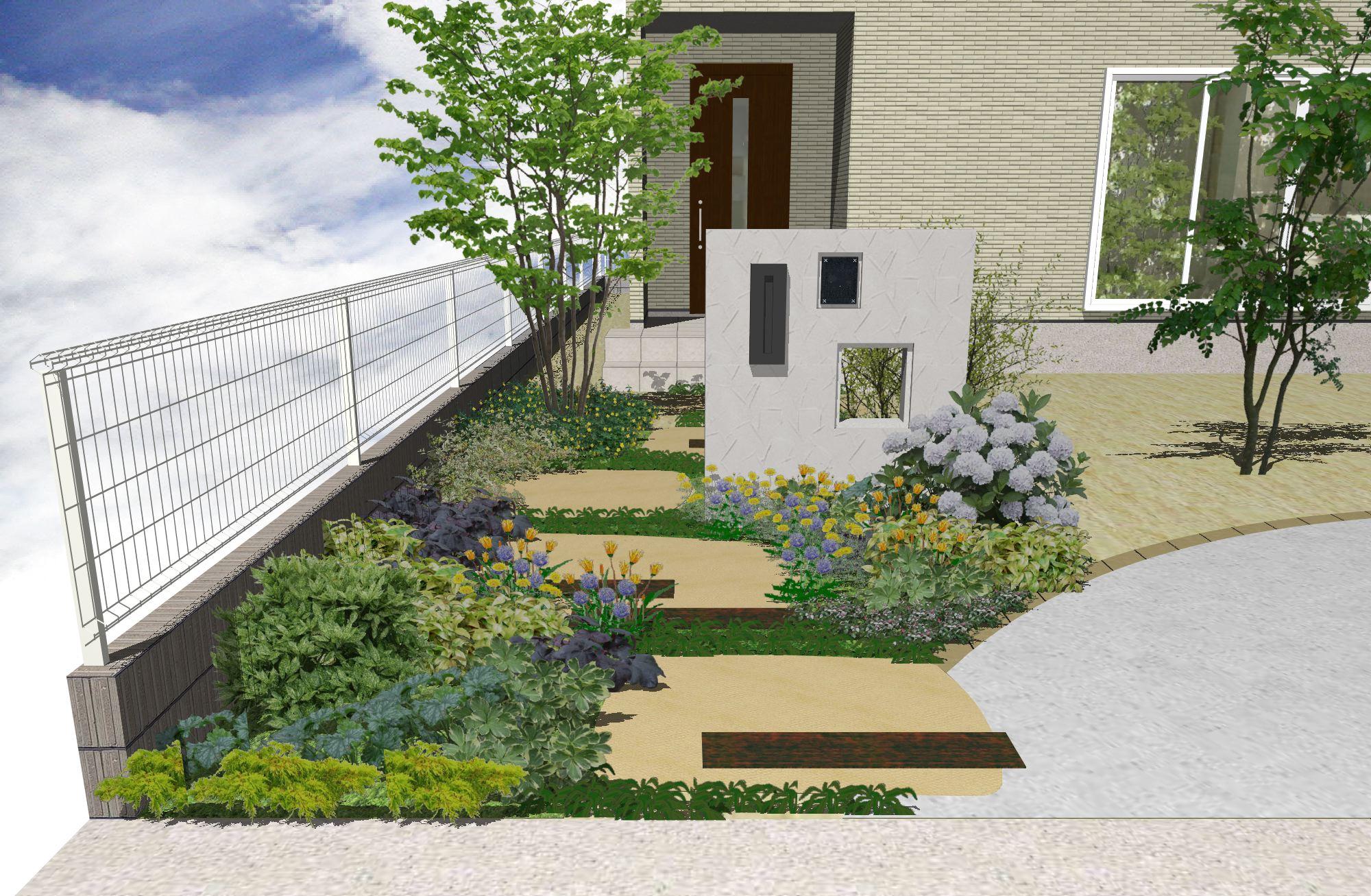 玄関前をおしゃれに彩る枕木門柱とアジサイ兵庫・大阪外構・庭工事。