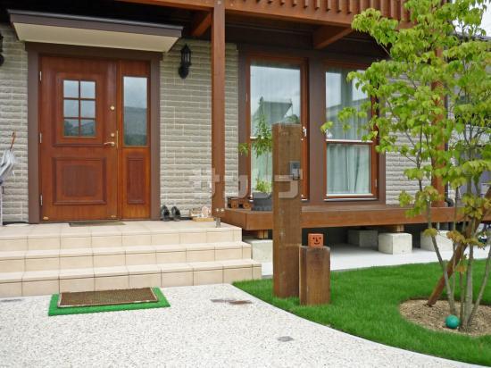 玄関アプローチステップ コンクリート製枕木 擬木ニッコー リアルウッドランバー床材 化粧砂利 ホワイトの外構施工例 現場番号:16237-ファミリー庭園滋賀店。