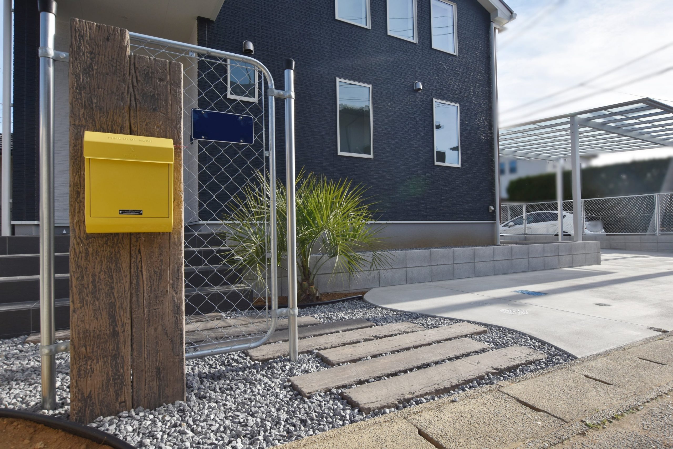 枕木による門扉 玄関アプローチ - 事例写真「スタジオのある家」注文住宅のハウスネットギャラリ。