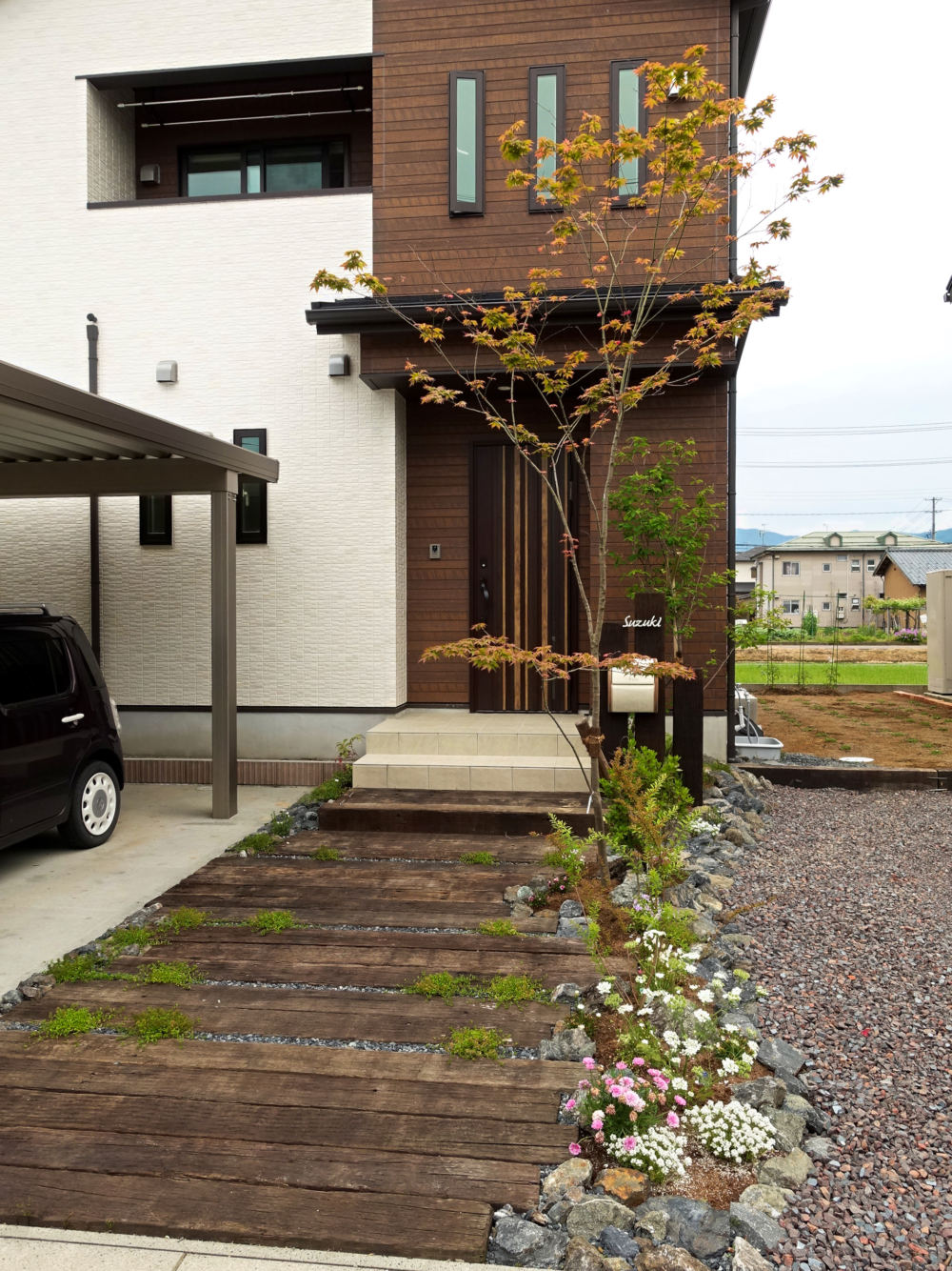 枕木アプローチとロックガーデンのナチュラル外構 – ガーデンスタジオ雅楽庭・新光園 – 新潟の庭・ガーデニング&外構・エクステリアデザイン工事。