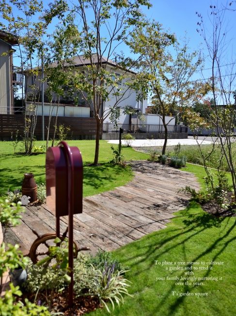 芝生と枕木のナチュラルなアプローチ ~駐車場のことなら板屋建設~浜松市周辺でエクステリア工事や外構工事、駐車場工事のことなら板屋建設。