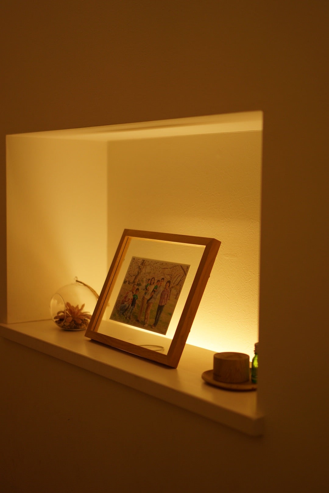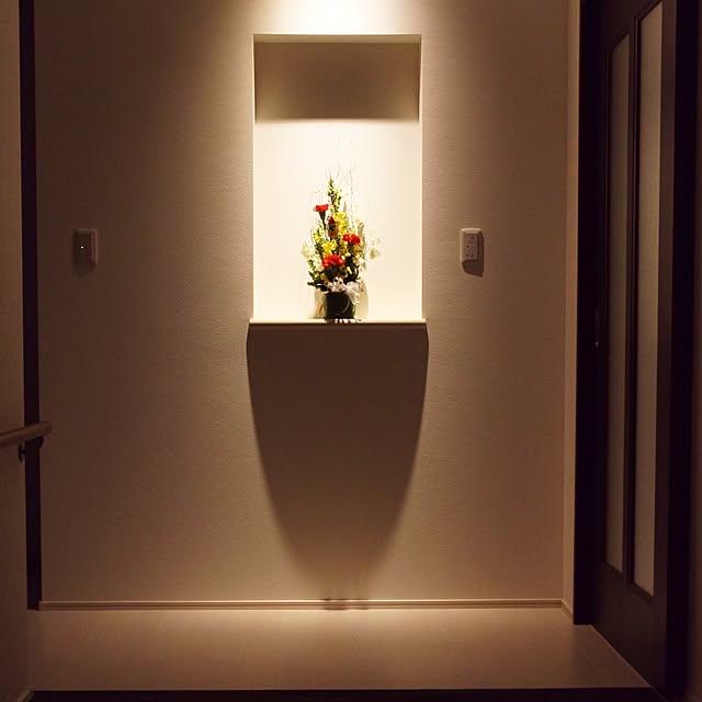 玄関ニッチと間接照明 『ただいま~』で最初に目に飛び込んでくる玄関ニッチ 間接照明の効果で飾りたいものが “いきいき”としてるようです。玄関のダウンライトと共に人感センサーで連動させることで、自動で点くのでスイッチで点ける手間もなく快適です。 家にお金を。