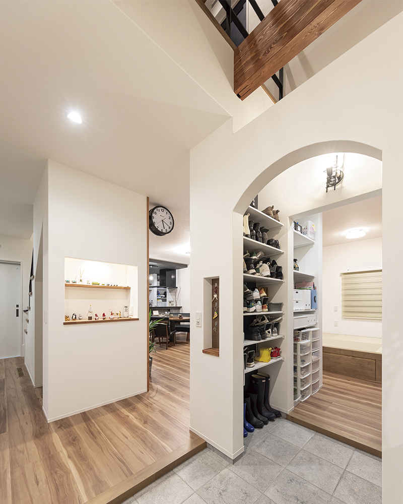 家の顔である玄関ホールは広めに確保し、潔感のある白でまとめた。ニッチには間接照明を設け、写真や小物を飾れるスペースに くふうイエタテ。