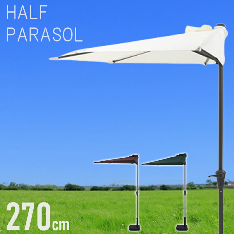 270cmパラソル 半円 ガーデンパラソル ハーフパラソル 半円パラソル ハーフ おしゃれ シンプル グリーン アイボリー ブラウン カフェ 庭ベランダ 日よけ 紫外線 対策 ガーデニング 日陰 日差し コンパクト スリム:ショップワールド。