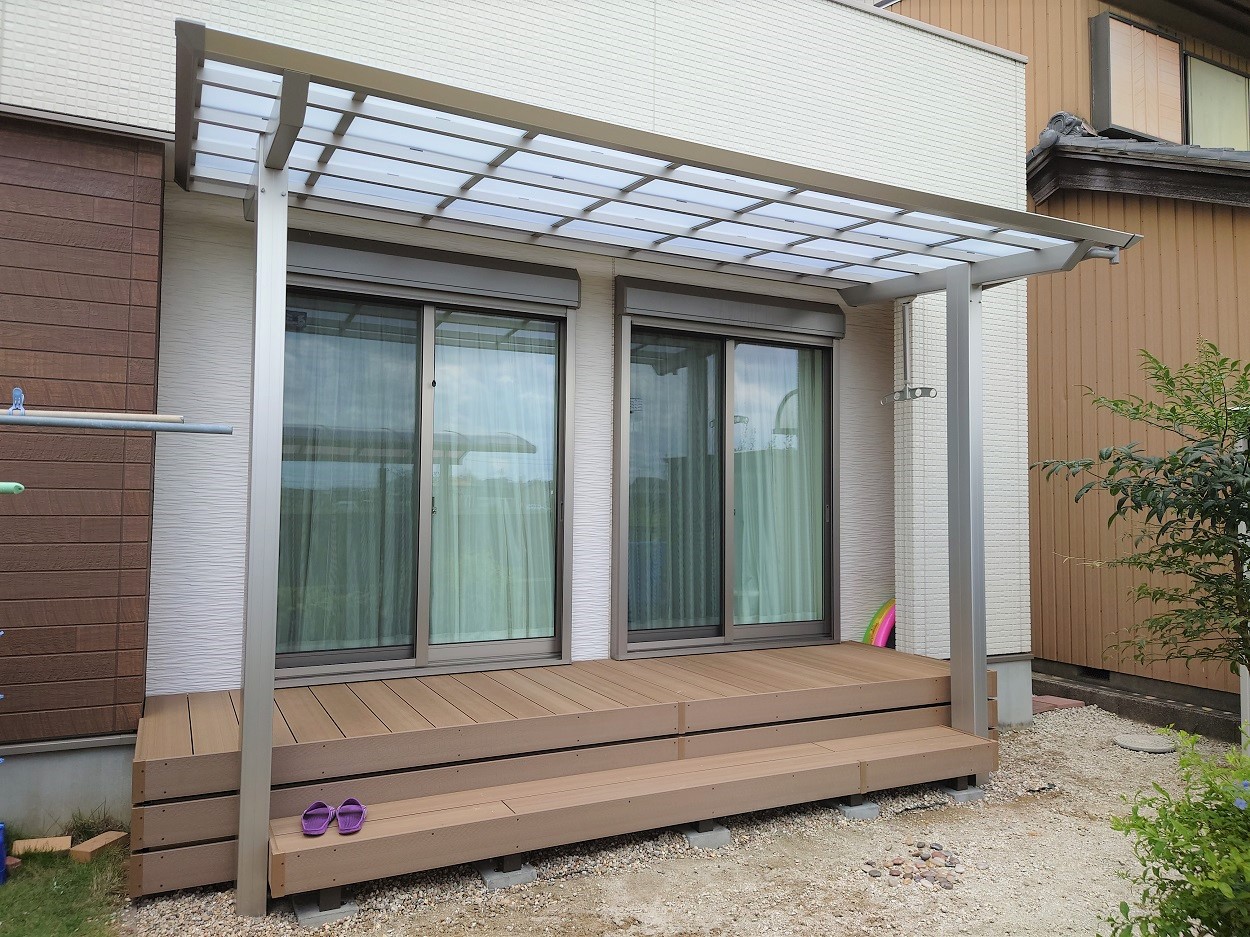 玄関の目隠しスクリーンと木樹脂デッキ・独立テラスの施工例一宮市外構・エクステリア・造園は庭づくり専門店 愛知県扶桑町 池之上造園へ。