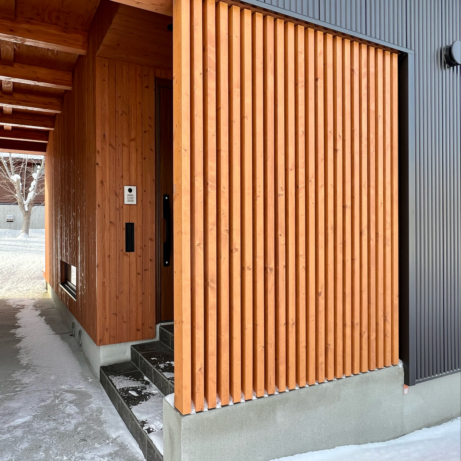 玄関にウエスタンレッドシダーの目隠しを設置して、オシャレにプライバシーを確保! リフォーム施工事例サンプロリフォーム。
