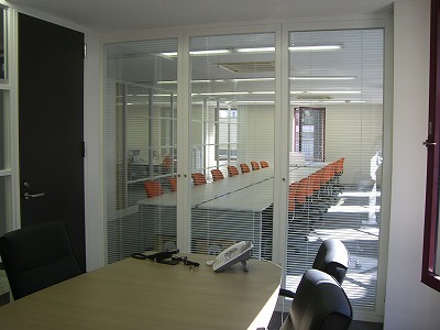 スチールパーティション ブラインド内蔵- オフィス木製家具デザイン。