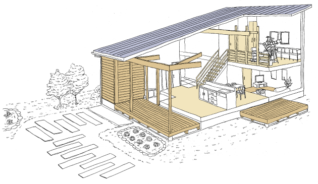 家族全員で使えるオープンな間取りの片流れ屋根のログハウス ログハウスのTALO。