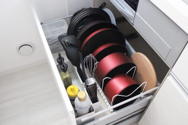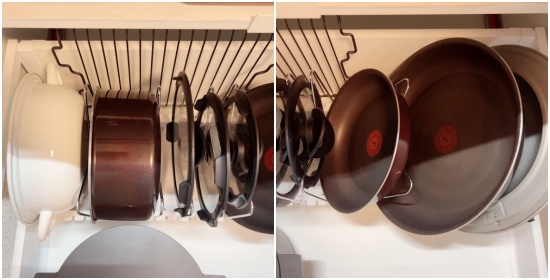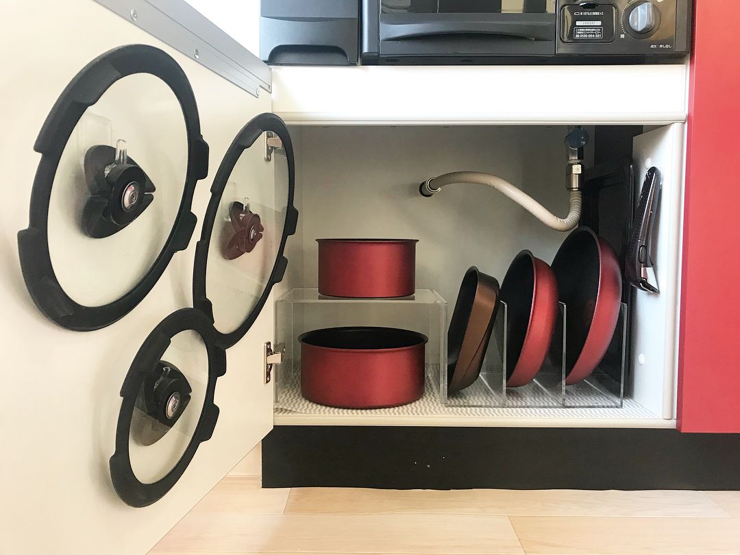 我が家が選んだ鍋蓋フライパンスタンドは縦置き+"斜め置き"も出来て伸縮可コンロ下引き出し鍋収納の悩みが解決 - petite size。