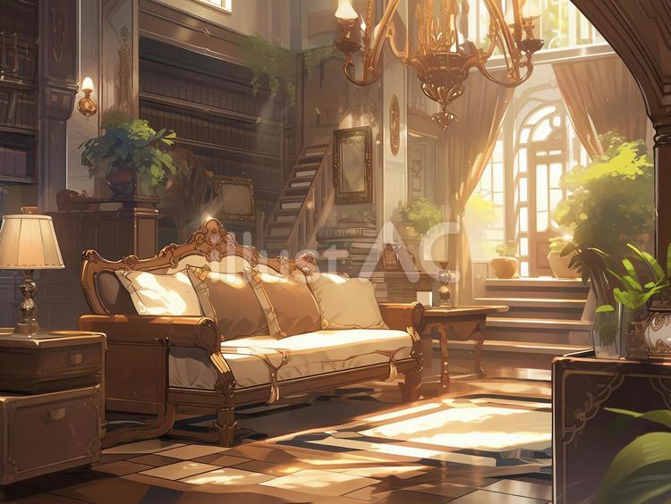 柔らかな光が差す室内に、アンティーク家具と本棚が並ぶ上質なリビングルームを描いたAI生成画像のイラスト素材288288530- イメージマート。