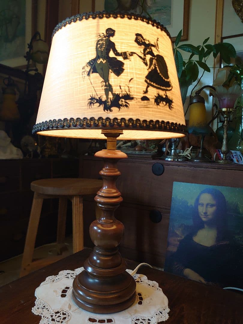 フランスアンティーク イラスト 影絵風 布シェード木製卓上ランプ 英国アンティーク、深いワインレッドの美しいフリンジ付き布シェード&テーブルランプ -フレンチアンティークスタイル イネスの部屋。