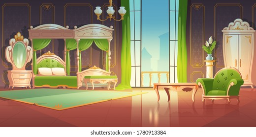 宮殿や城のピンクの王女の部屋。バロック様式のアンティーク家具、化粧台、鏡、椅子、本棚、女の子のポートレートを持つ高級インテリアのベクター漫画イラストの イラスト素材・ベクター Image 188809979。