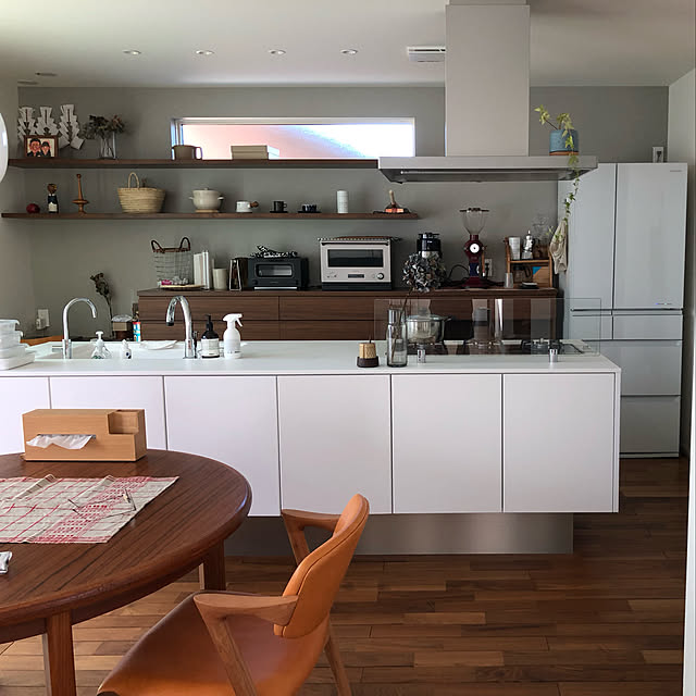 チーク床の家』北欧のヴィンテージ家具によく使用されている少し赤みがかったチーク材。このチーク材を床やキッチンカウンターに使用した贅沢な空間ですね。Photo:Masato RoomNo.923344 ▶︎この部屋のインテリアはRoomClipのアプリからご覧いただけます。アプリは。