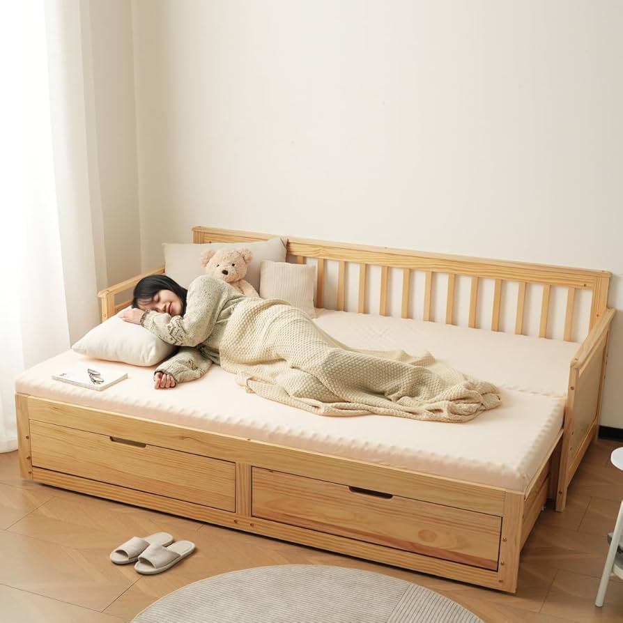 伸長式シングルベッド 木製ソファベッド 伸長式ベッド 2way パイン材 無塗装 60 90cm ディベッド ソファ ベッドフレーム パイン材ワンルーム 下収納 おしゃれ マットレス 無段階調整 リビング ダブル ソファベッド 省スペース 来客用 パイン天然木の横伸縮ソファベッド。