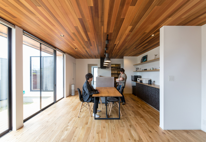 木のぬくもりに満ちたLDK。大きな窓、天井から外の軒までつながる。