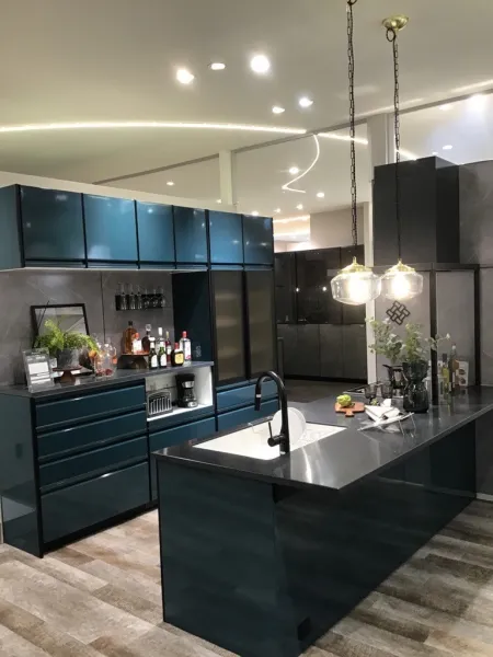 キッチン トレーシア I型・ペニンシュラ型 対面式 レイアウト ブルーグリーン SK1386の展示品 福岡ショールームタカラスタンダード。