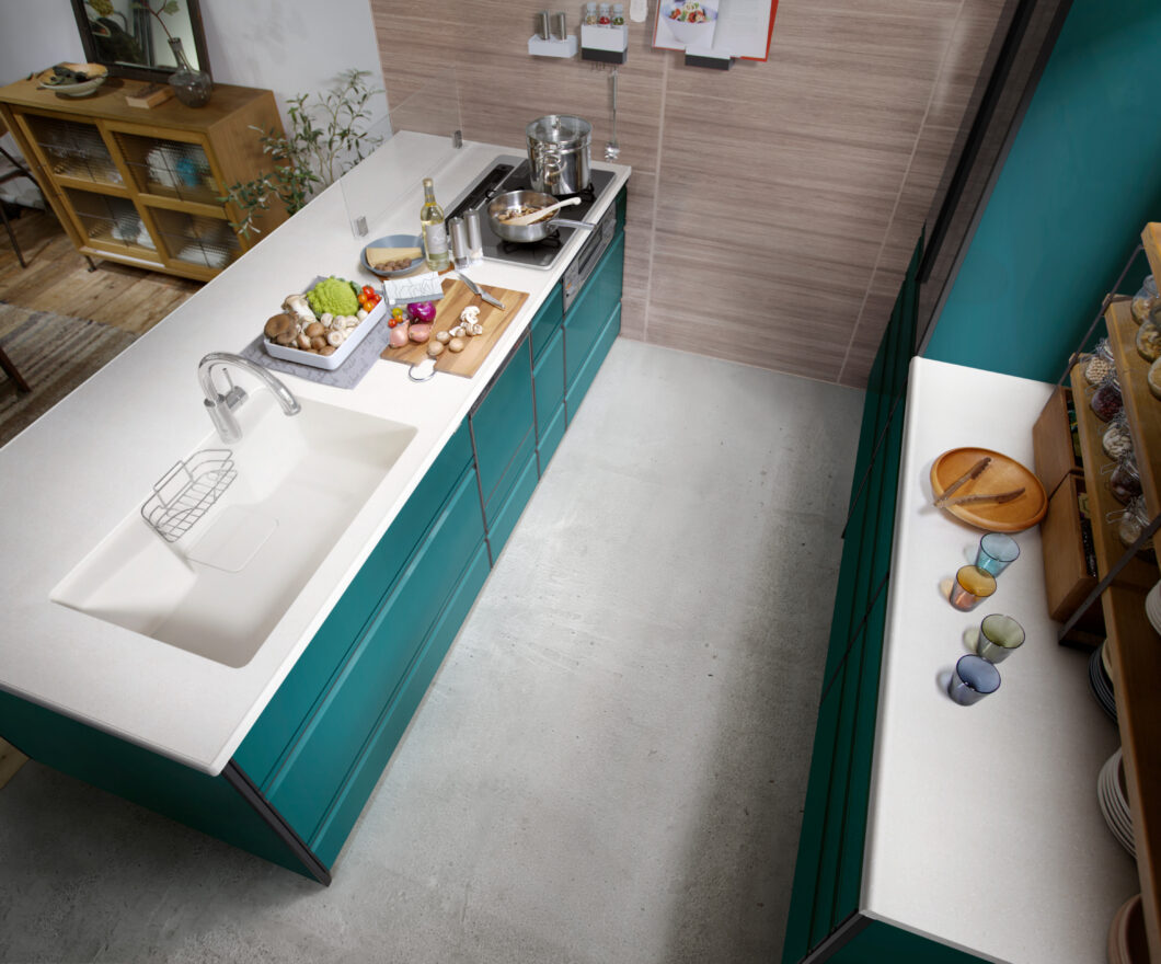 爽やかさと癒しを感じられる「プリズムブルーグリーン」が印象的なキッチンへリフォームリフォーム実例TOTO株式会社。